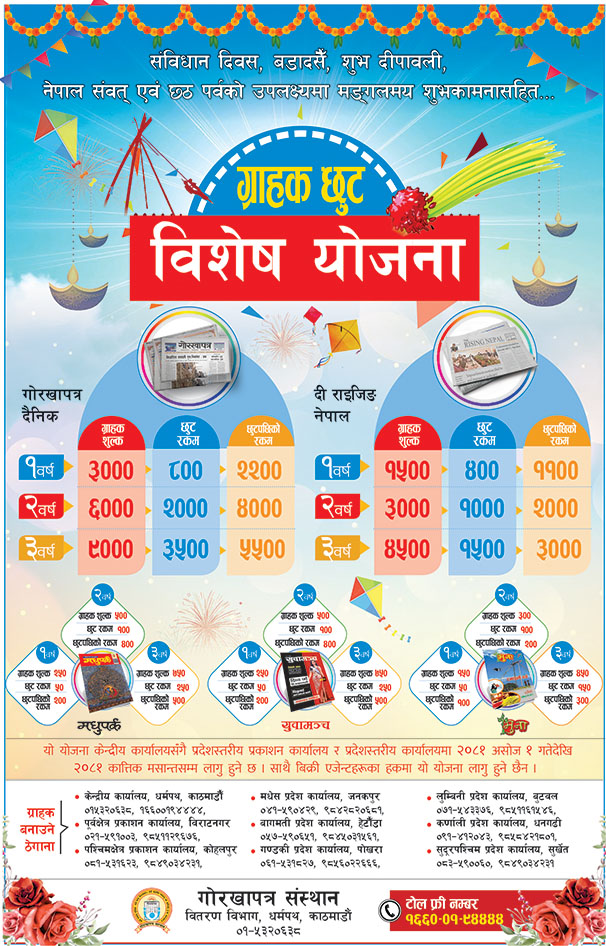 संविधान दिवस, बडादशैँ, शुभ दीपावली, नेपाल संवत् छठ पर्वको उपलक्षयमा मङ्गलमय शुभकामनासहित गा्रहक छुट विशेष योजना ।